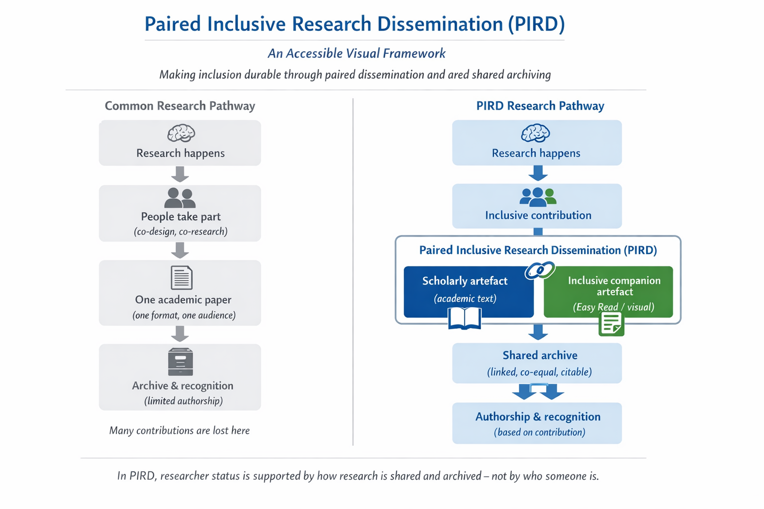 This concept note advances Paired Inclusive Research Dissemination (PIRD) as a methodological intervention in scholarly authorship, dissemination, and archiving. PIRD formalises the deliberate production, release, and long-term preservation of research outputs as paired, parallel artefacts that are intentionally designed for different audiences while constituting co-equal expressions of a single intellectual contribution. Rather than positioning accessibility as a secondary concern, the method embeds inclusive dissemination at the core of scholarly production.